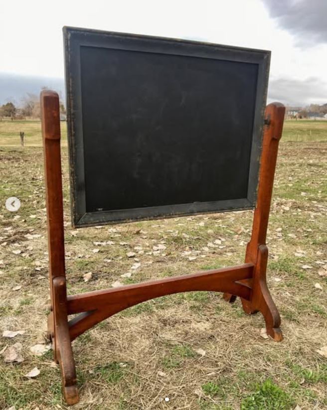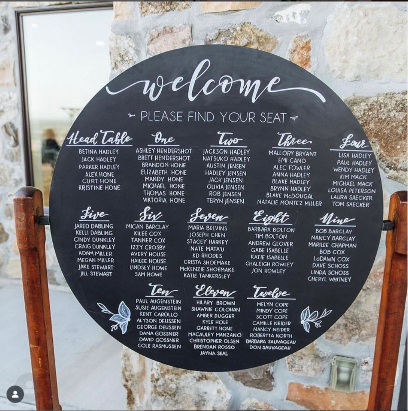 gladhill round chalkboard This round, double sided, sign chalkboard comes blank. You can write whatever you wish with chalkboard markers or add your own vinyl lettering. The stand is a vintage piece that is stunning.Quantity: 1Dimensions: 45" wide x 19" deep x 63" tallCircle Diameter 30"Rental Price: $50