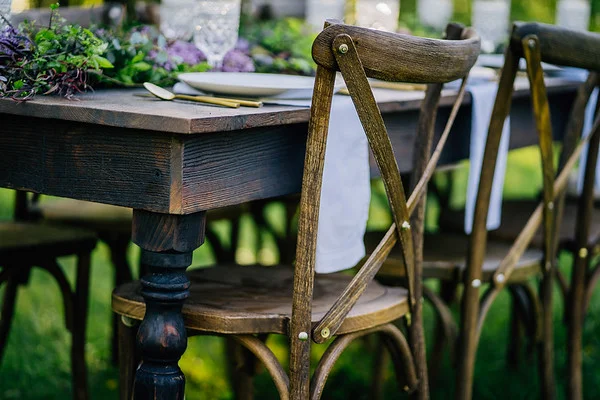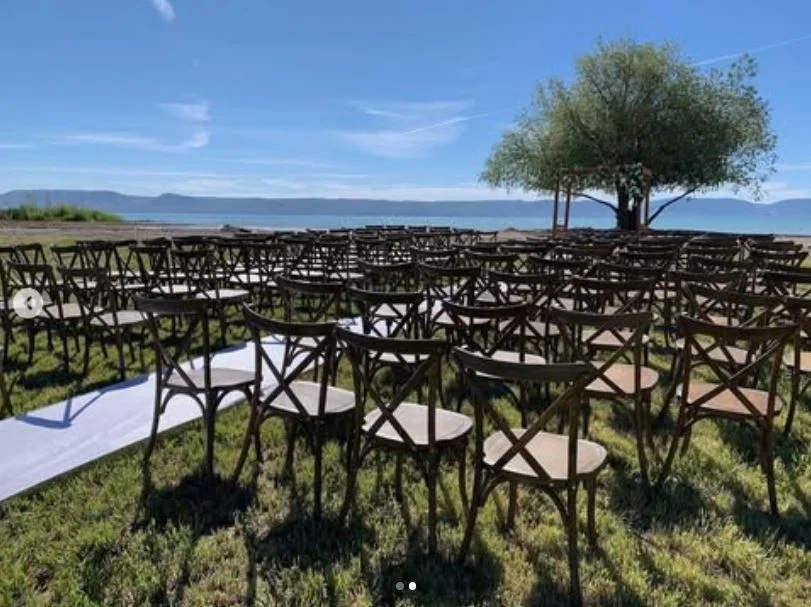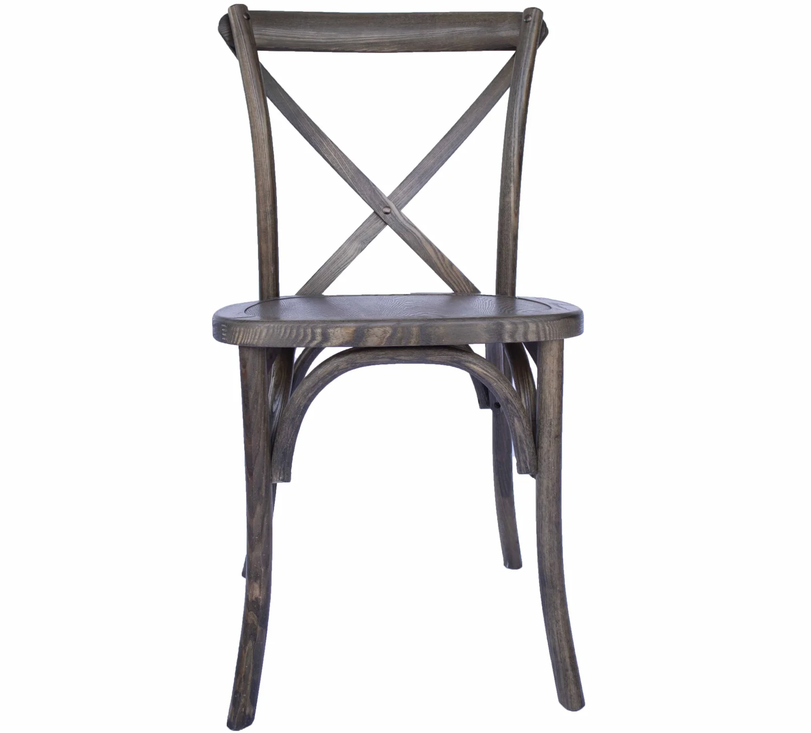 These cross back wood chairs look perfect with our farm tables or round tables. Wood chairs give warmth to your event.