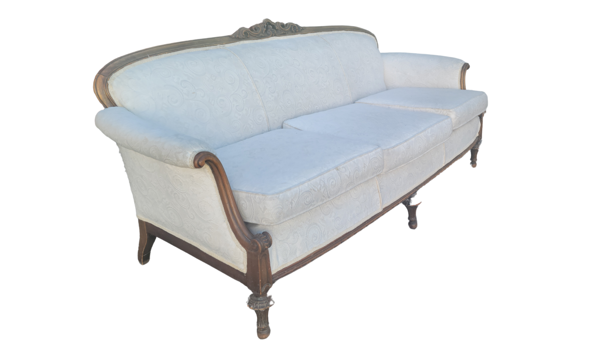 Dove Sofa Vintage cream colored sofa with beautiful original upholstery. It is detailed with a hand carved wood frame.Quantity: 1Dimensions: 85" wide x 32" deep x 33" tallRental Price: $75.00