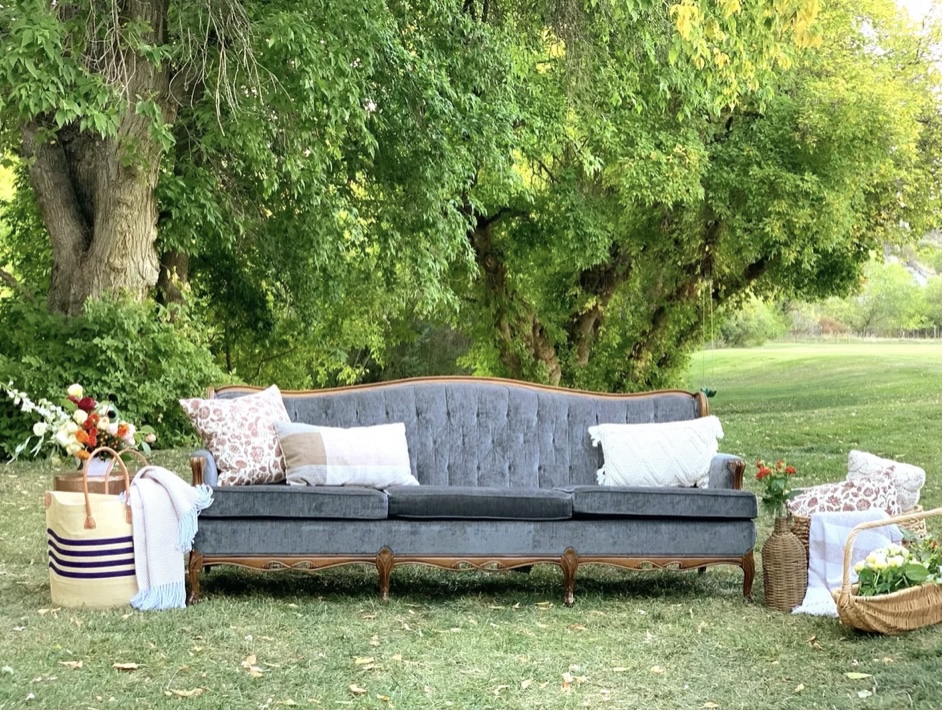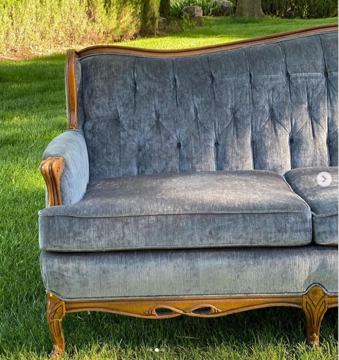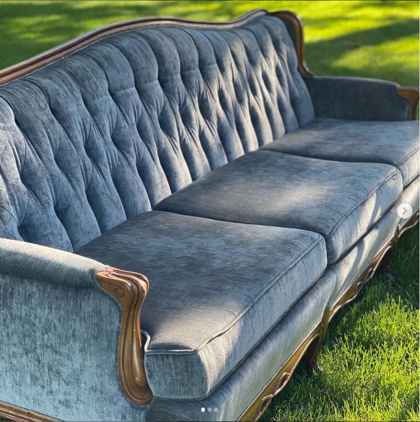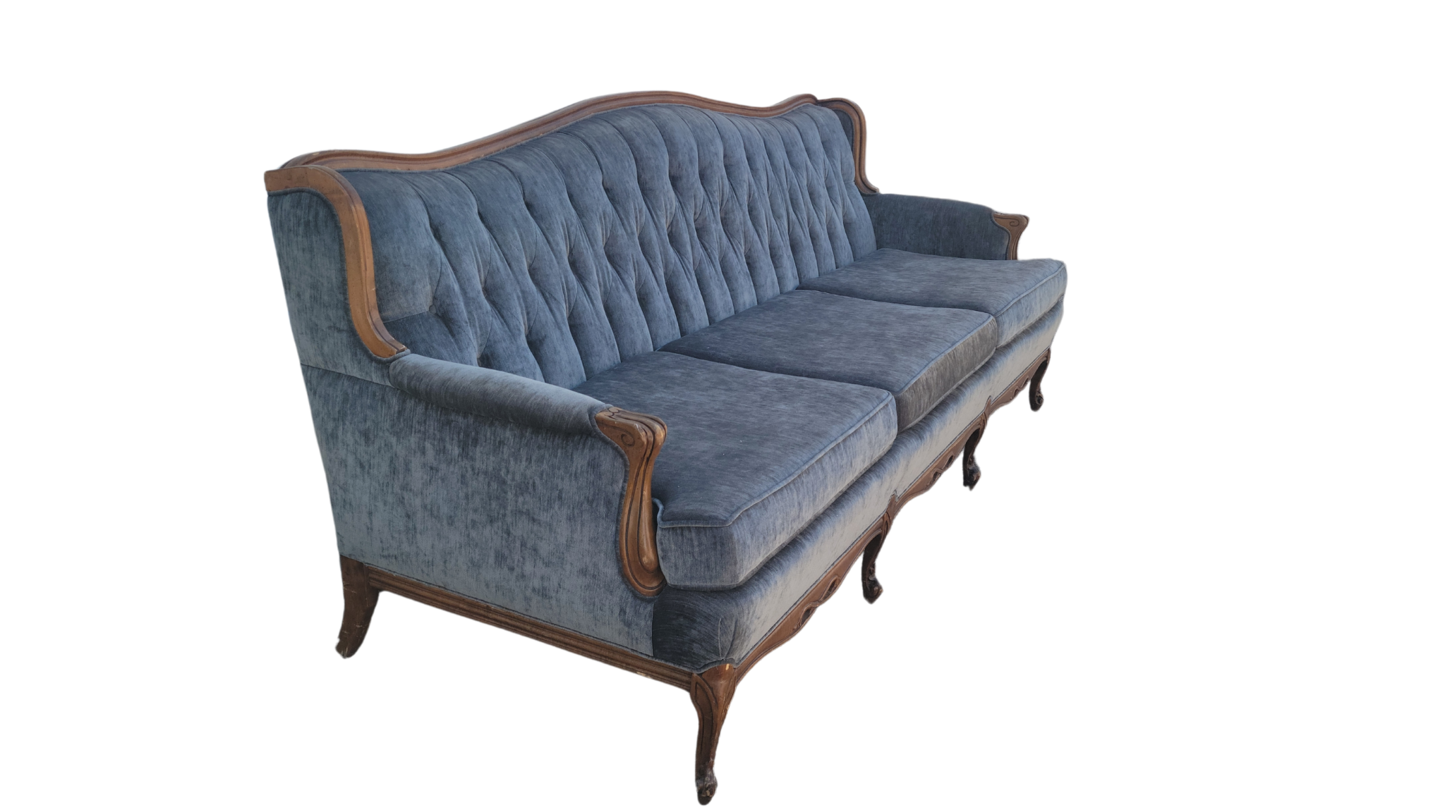 Smokey Sofa Vintage gray-blue colored sofa. It is detailed with a hand carved wood frame.Quantity: 1Dimensions: 84" wide x 35" deep x 35" tallRental Price: $75.00