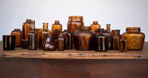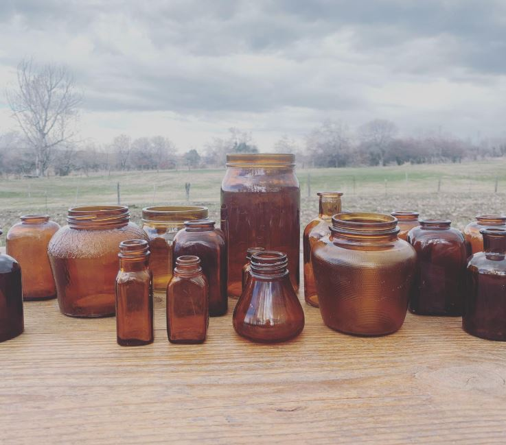 amber glass vases Beautiful collection of antique and new amber glass bottles, perfect bud vases.Quantity: 45Dimensions: variesRental Price: $1.75 each
