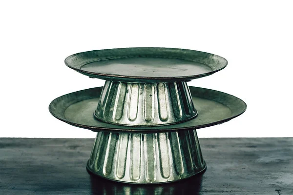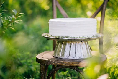 Magnolia Cake Stand Galvanized metal cake stands available in 2 sizes.Quantity: 2Dimensions: 16" diameter x 5" tallDimensions: 20" diameter x 7" tallRental Price: $12 each