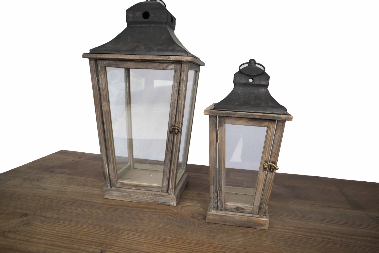 wedgewood lanterns Reminding us of traditonal European lamps, these handsome lanterns are crafted of warm wood. Quantity: set of 2Dimensions: Small - 7" x 7" x 15" tallDimensions: Large - 11" x 11" x 22" tallRental Price: $21